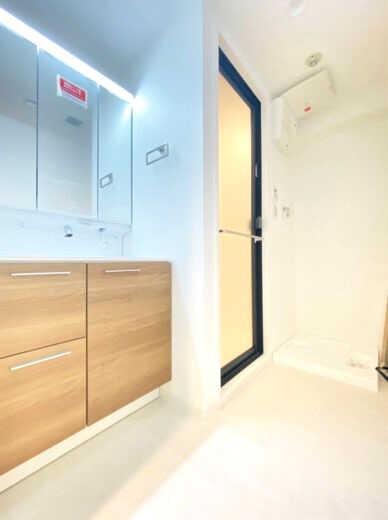 洗面室には洗面化粧台の他に洗濯機スペースと浴室がまとまっていて脱衣室も兼ねています。洗面化粧台は身だしなみを整えるのに便利な三面鏡付き。裏がキャビネットになっているので、洗面周りに散らかりがちな細々したものもスッキリと片付けることができますよ。
