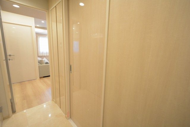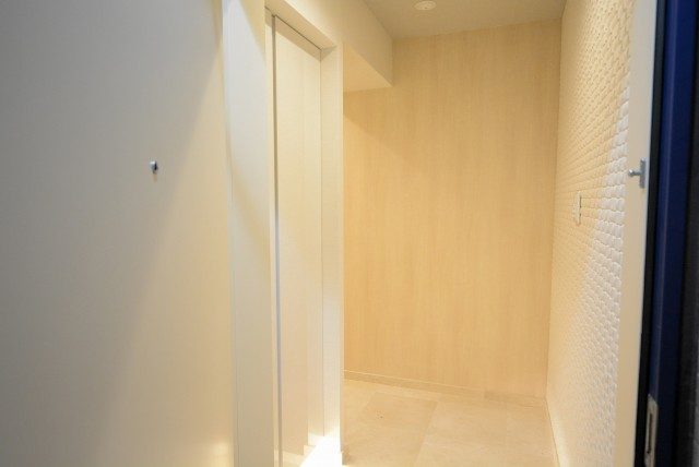 間接照明の設置された折り上げ天井や、廊下から玄関にかけてのタイル貼りなど高級感たっぷりの空間です。人感センサーが自動的にライトのON・OFFをしてくれるので、暗い中手探りでスイッチを探すなんてこともありません。いつでも明るい玄関が迎えてくれるのは嬉しいものです。