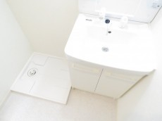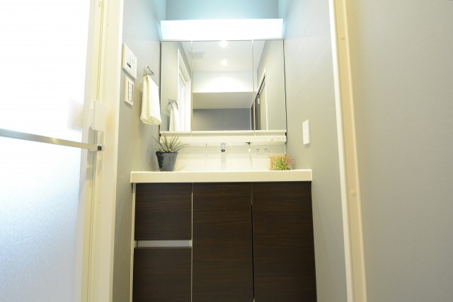 廊下をまっすぐ進んだ先は洗面室。バスルーム、洗濯機置場、洗面化粧台がまとまっています。脱衣スペースがゆったりしているのもうれしいですね。