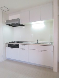 キッチンもお部屋にあわせて白。収納スペースも上下にたっぷり用意されています。