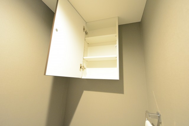 基礎化粧品は鏡裏、スライド棚にはドライヤー、開き戸には掃除用品や洗剤・・・