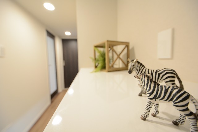 玄関ホールに設置されたシューズBOXは上がカウンターになっており、インテリアや観葉植物などのディスプレイスペースにピッタリ。まわりが白なのでどんな物を置いても映えそうですね!