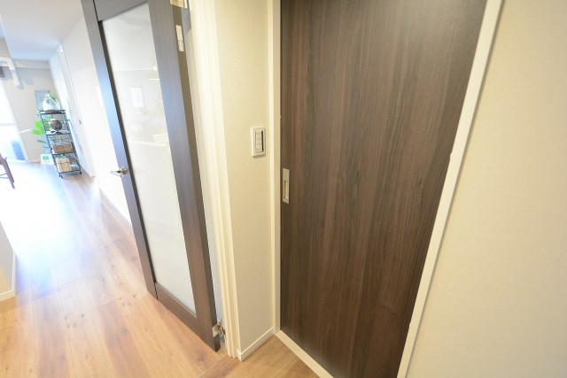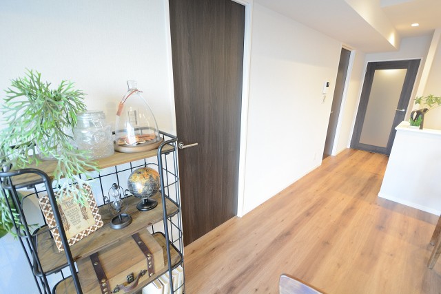 玄関をあがると目の前に廊下がまっすぐのびています。フローリングも白っぽい色合いです。手前から順番にご紹介いたします。