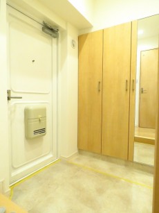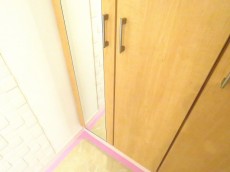 玄関横にはたっぷり仕舞えるトールサイズのシューズBOXが設置されています。手持ちの靴はこの中にすっぽり収まるのではないでしょうか。表扉の一部には縦長の鏡が設置されており、お出かけ前の身だしなみチェックもサッと行えて便利です。