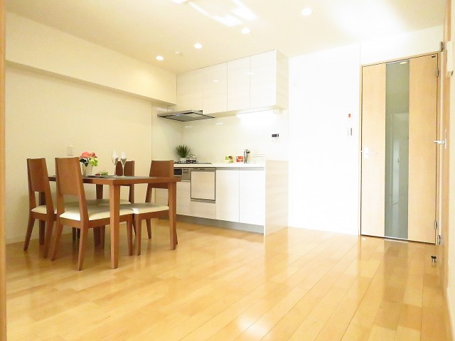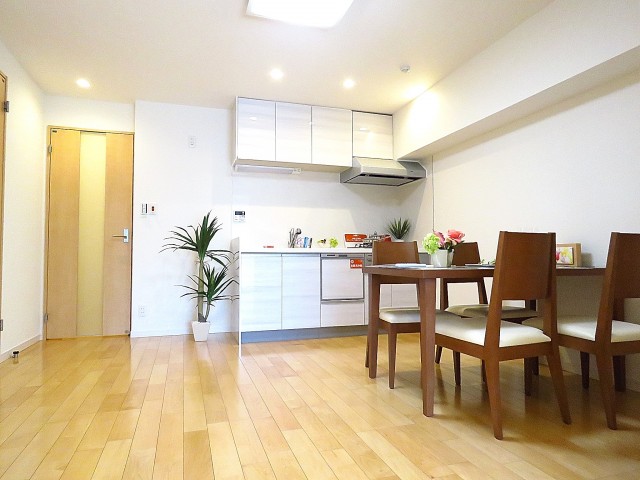ダイニングキッチンは約8.9帖。ダイニングテーブルとキッチン家電、ちょっとした収納家具を置いてちょうど良い広さでしょうか?(室内に設置された家具はついてきます。)