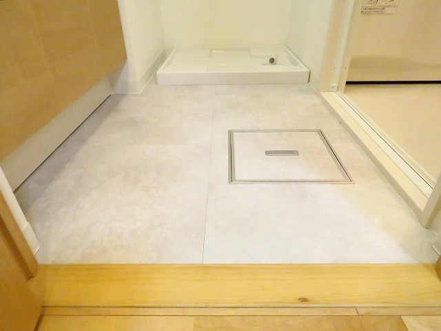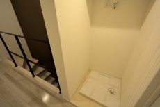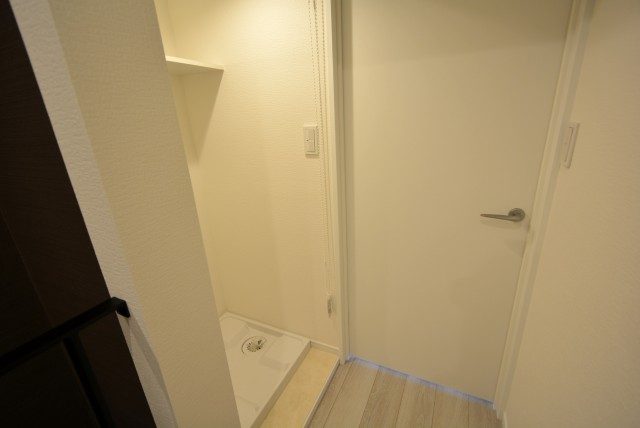洗濯機置場。横の壁面には可動棚が設置されています。