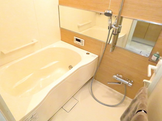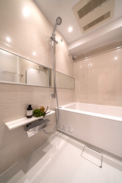 浴室はお部屋と統一感をもたせたベージュのパネルを使用。ほっとリラックスできる優しい雰囲気になっています。追焚機能付きなのでいつでも温かいお風呂に入れますよ。浴室暖房や浴室衣類乾燥が可能な浴室換気乾燥機付き。