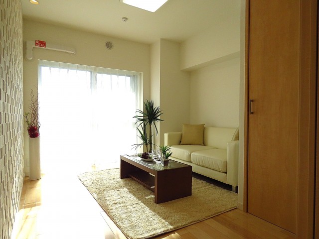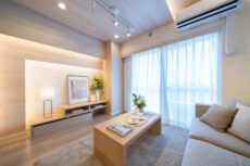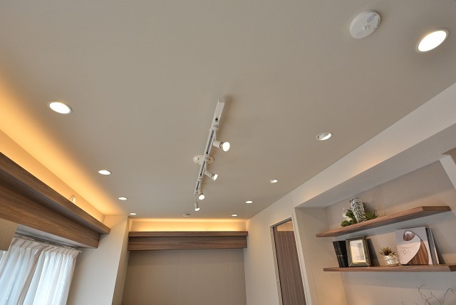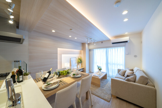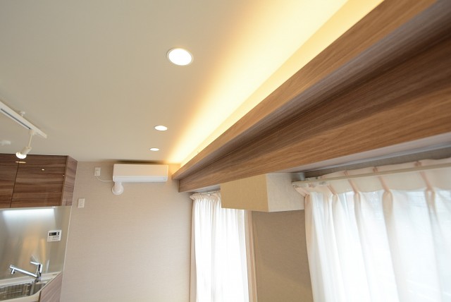 南東向きバルコニーに面した明るいお部屋です。玄関廊下と同じベージュを基調としたナチュラルな雰囲気でとても居心地がよさそうですね。天井や壁に張られた木目パネルには間接照明が設置され、立体感のある広がりを演出しています。