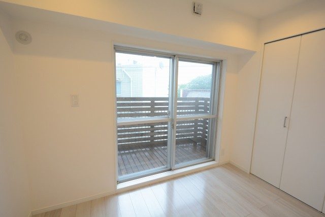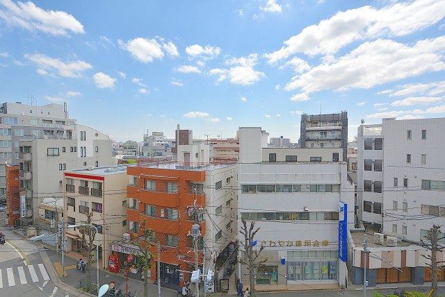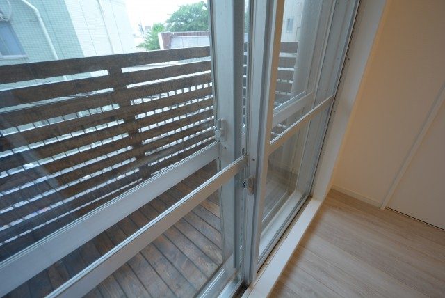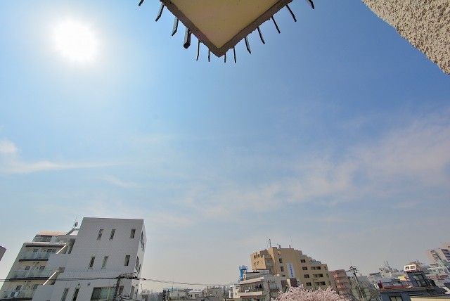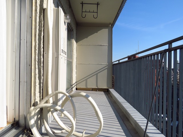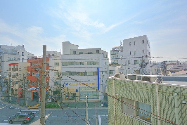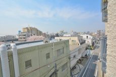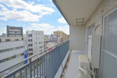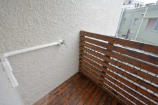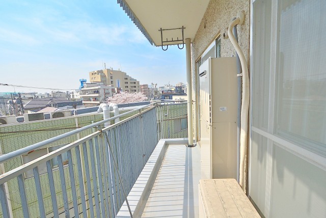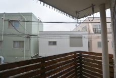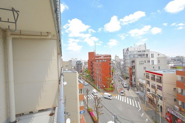 最後にバルコニーに出てみます。どちらの洋室からも出られ、両方とも扉は二重サッシになっています。扉をしめれば駒沢通りの車の走行音は気になりません。(音の感じ方には個人差がございますので、ご内見の際に確認されることをおすすめします。)