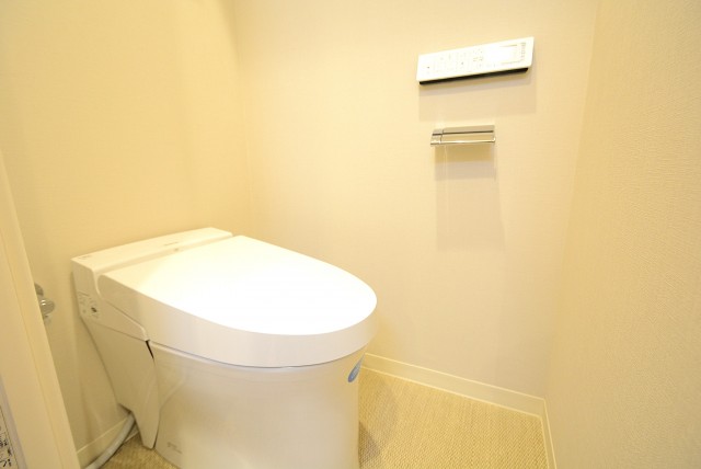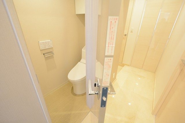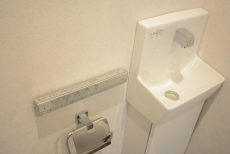 トイレはウォシュレット付き。上にペーパーのストックや小物の収納に便利な吊戸棚が設置されています。