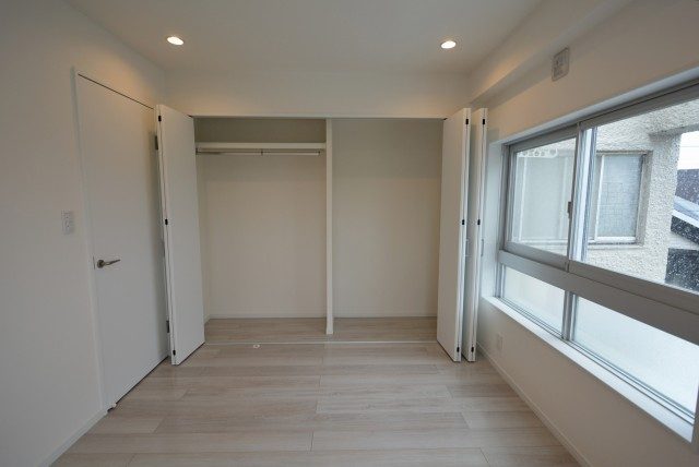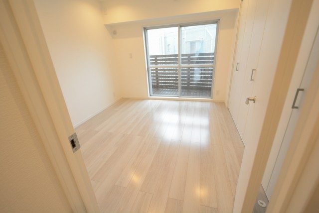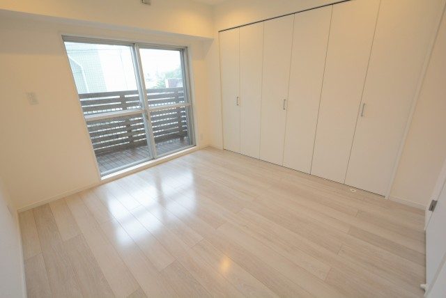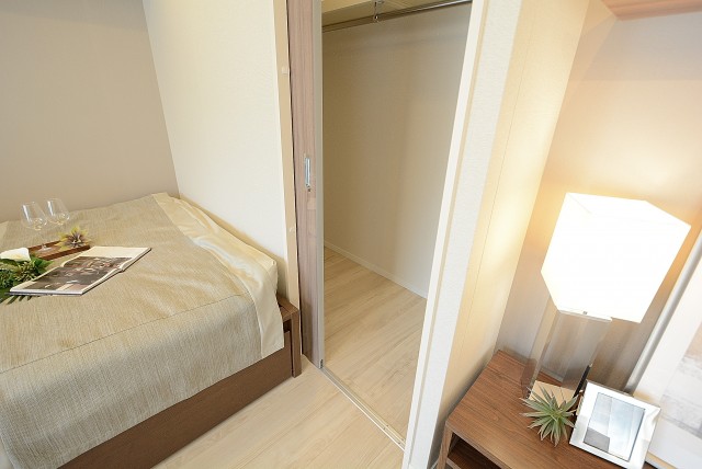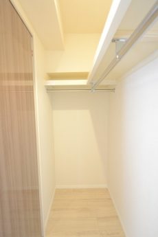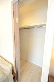 LDKと同じバルコニーに面したお部屋です。あまり凸凹のないきれいな形なのに加え、入口が引き戸なので、スペースを無駄なく使うことができますよ。収納はウォークインクローゼット!中の棚やハンガーパイプは高さ調節可能です。