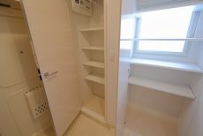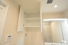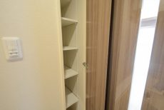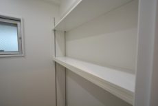 洗濯機置場の横にも可動棚がついた収納が設けられています。