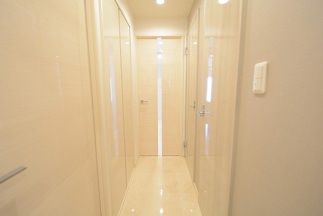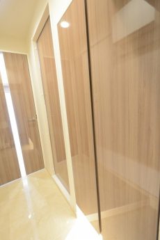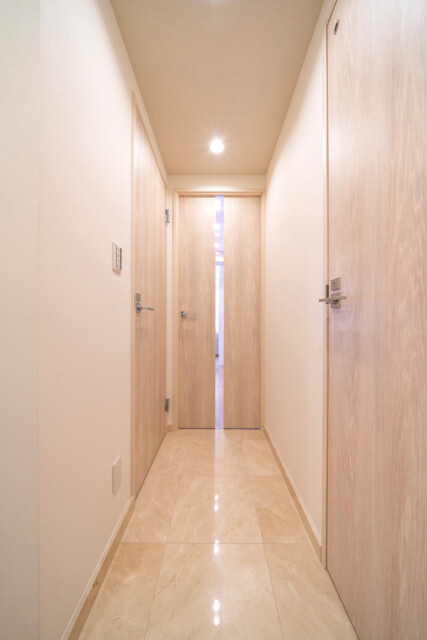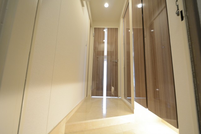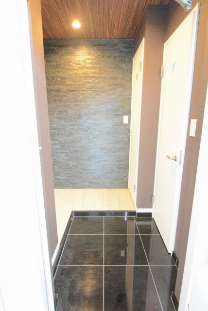 玄関から廊下にかけては高級感のある大理石貼り!暖色系なので、木のぬくもりを感じられるような温かみのある空間になっています。照明には人感センサーが付いているので、いつでも明るいお部屋が迎えてくれますよ♬