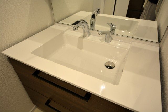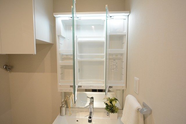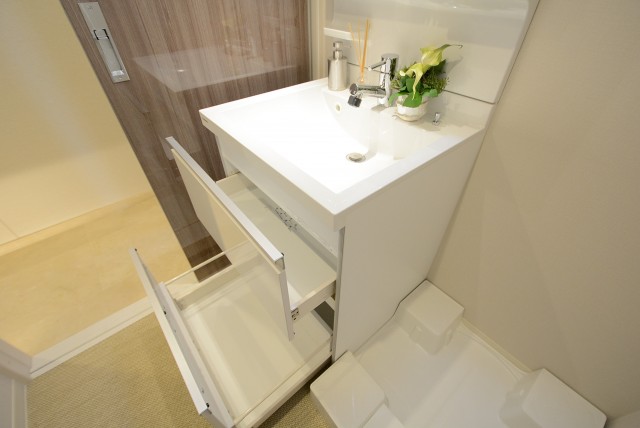 洗面化粧台は鏡の裏、引き出しなど小物の収納スペースが豊富。