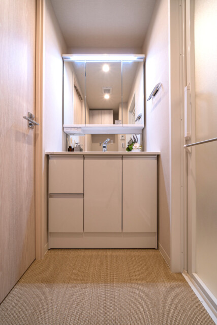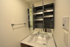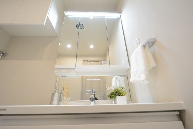 洗面室には洗面化粧台の他に浴室と洗濯機スペースがまとまっていて脱衣所も兼ねています。洗面化粧台は身だしなみチェックに便利な三面鏡付き。上部に付いた照明のおかげで影になることもありません。裏はミラーキャビネットになっていて、洗面周りに溢れがちな細々としたものもスッキリと片付けられますよ。