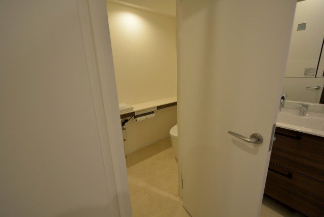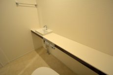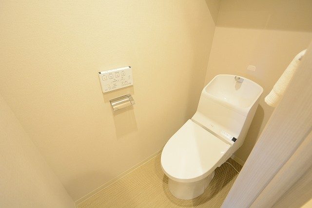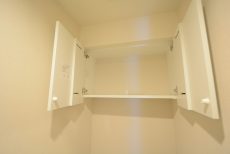 トイレはウォシュレット付き。ペーパーのストックを仕舞っておくのに便利な吊戸棚も設置されています。