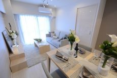 ダイニングテーブルが置いてあるので実際の広さや生活イメージもわきやすいのではないでしょうか?(家具もついてきます。)