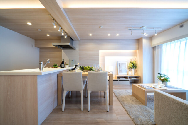 バルコニーに向かってキッチン、ダイニング、リビングと並んだオーソドックスなタイプ。家具のレイアウトに悩むこともありません。家族構成やライフスタイルによっては、ダイニングテーブルをもう少し小さくして大きめのソファーを置いたりなんかも良さそうですね。