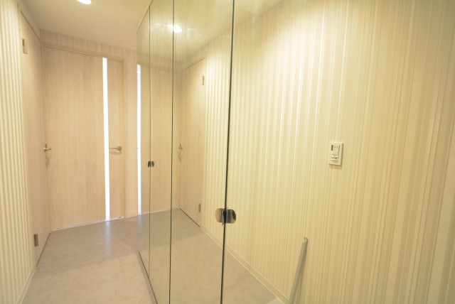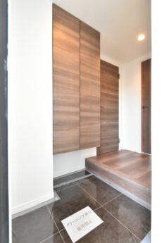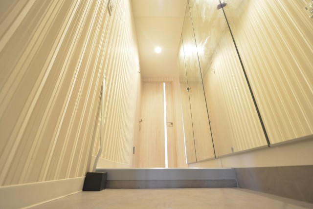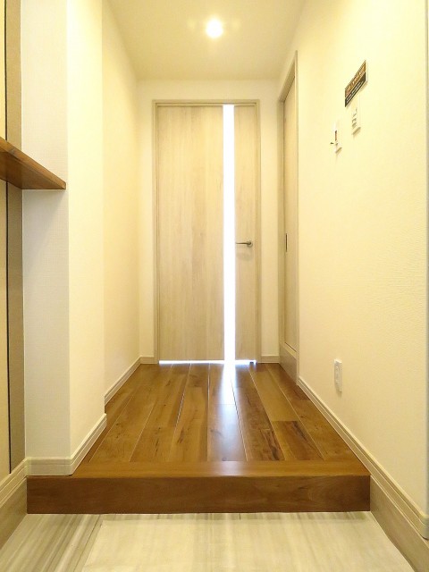 玄関廊下は落ち着きのある色使いで、疲れて帰ってもホッとできそうな空間です。フットライトが足元を照らしてくれているのも嬉しいですね。
