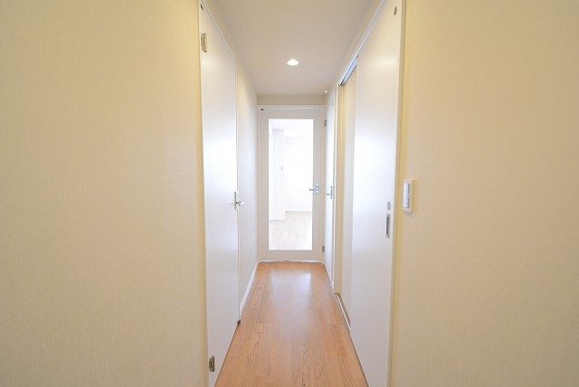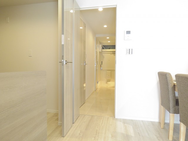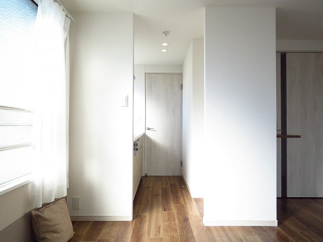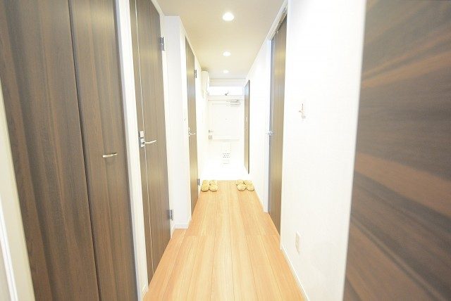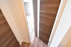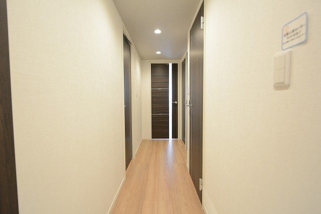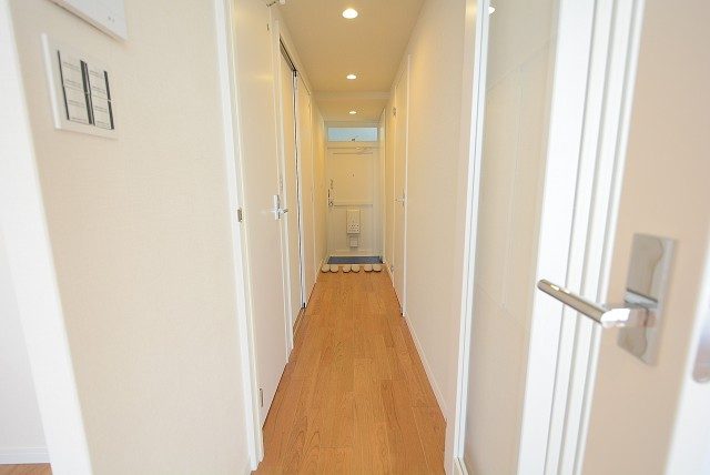 玄関から真っ直ぐに伸びた廊下は白とダークブラウンの落ち着いた雰囲気。リノベーション完成直後ということでとても綺麗ですね。まさに新品って感じです!