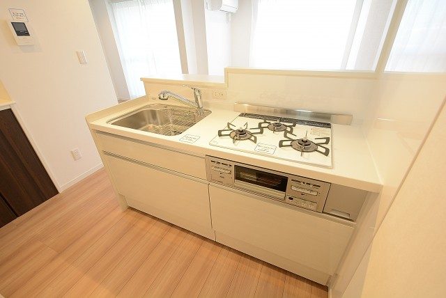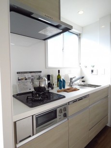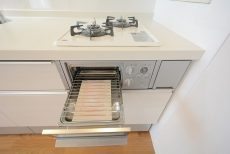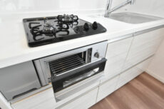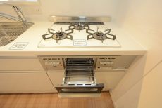コンロは3口、グリル付き。グリルってあまり使われてないとか聞きますが、我が家では結構頻繁に使っています。魚のイメージが強いですが、肉や野菜などなんでも美味しく焼けるんですよ。お掃除が面倒な方はグリルパンを使うのもお勧めです。吊戸棚付き。