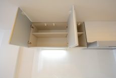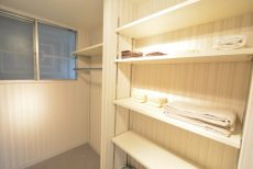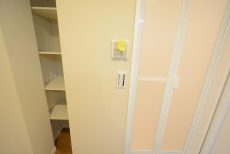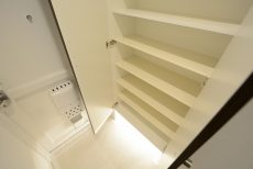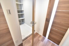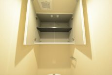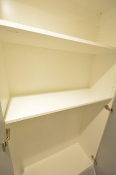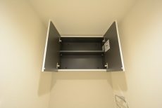 間取り図にはありませんが衣類やタオルなどの収納にばっちりな収納棚付き。洗濯機スペースには吊り棚が付いているので、洗濯洗剤などのランドリー用品はそちらへどうぞ。