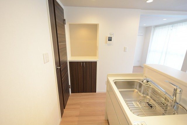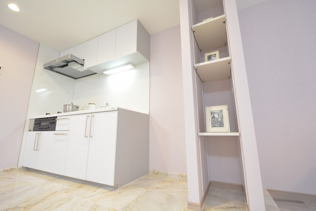 冷蔵庫置場の隣には棚があります。写真の様に棚に思い出の写真などを飾ればよりお好みの空間になります✿