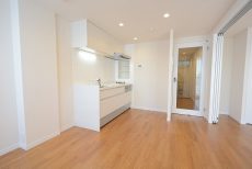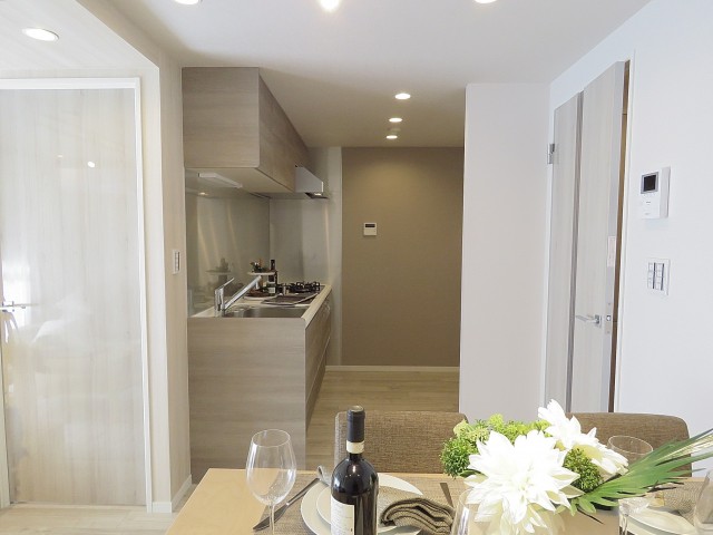 キッチンは壁付けタイプ。場所をとらずにお部屋を広く使えるのが特徴です。ただし、キッチン内が目立つのでなるべくキレイにしておきましょう!