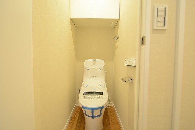 トイレはINAX製の温水洗浄機能付き。トイレットペーパーや掃除道具を収納するのに便利な吊戸棚も付いています。