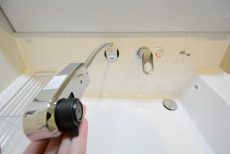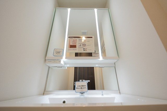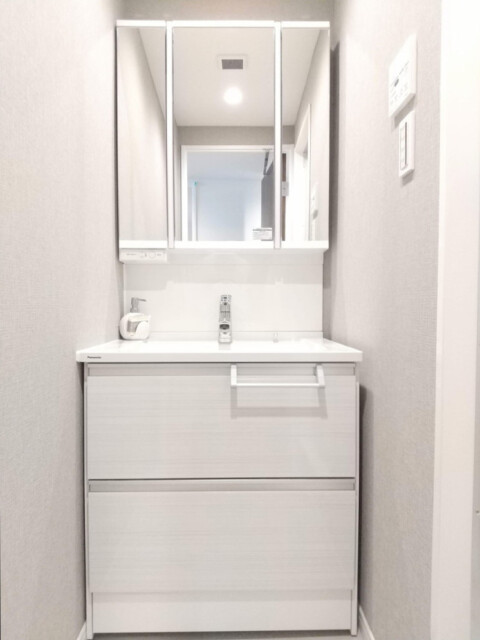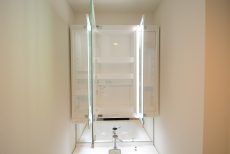 洗面室には洗面化粧台と浴室がまとまり、脱衣所も兼ねています。洗面化粧台は三面鏡付。なんと、鏡の間に照明が付けられ鏡を開いても影にならないようになっているんですよ!裏がキャビネットになっているので、洗面周りに散らかりがちな細々としたものを片付けるのに便利です。
