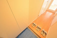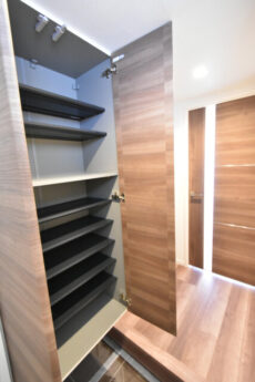 シューズボックスは斜めに立てかけるようなタイプ。靴屋さんに展示されているような感じで、中の靴がひと目で確認可能です。ただし、高さのある靴は入らないのでご注意を。