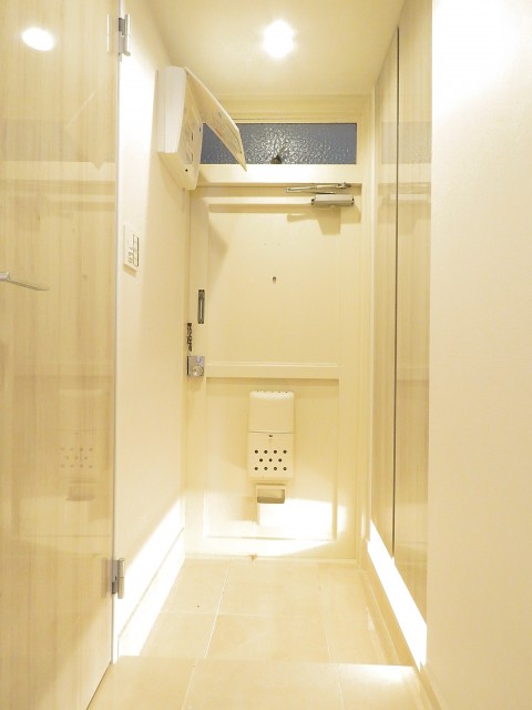 白基調の明るい明るく清潔感のある玄関ホール。人感センサがーついているので人の気配にあわせて自動で照明が消灯します。消し忘れがなく経済的。