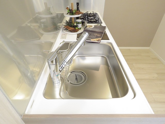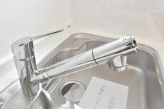 キッチンはフローリングに馴染む木目柄。正面に窓があるのでお料理中の熱や匂いも解消しやすいのがうれしいですね♪水栓は浄水機能付き、コンロは2口、食洗機付きと設備も充実しています。