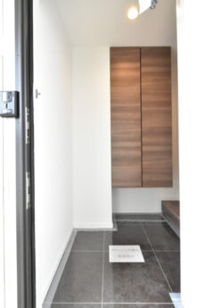 玄関ホールの左右にはトールサイズのシューズBOXとニッチカウンターがついています。アクセントクロスもステキですね。この雰囲気に合わせて置く物を選んでみてはいかがでしょう?