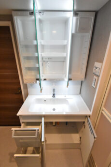 洗面化粧台は鏡裏がキャビネットになっているので、洗面周りに散らかりがちな細々したものもスッキリと片付けることができますよ。