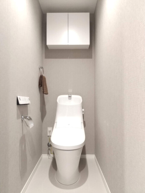 廊下を進んで右側の扉はトイレ。ウォシュレットとペーパーのストックや小物の保管に便利な吊戸棚がついています。