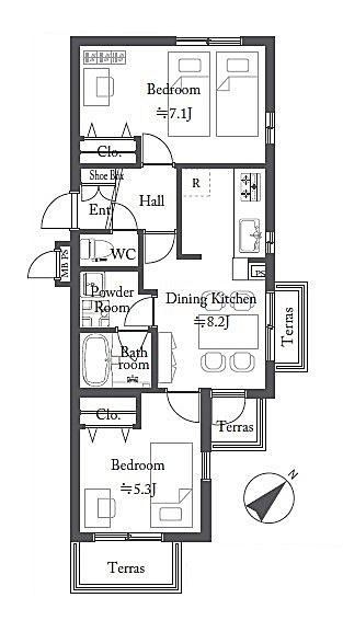 お部屋は1階、専有面積46.71㎡の2DK。お一人暮らしやDINKSの方にお勧めのお部屋です。テラスの先にはちょっとしたお庭も付いていますよ。では、早速行ってみましょう!