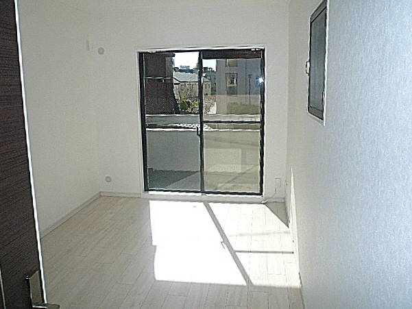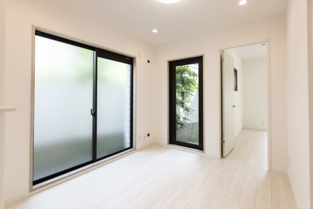 テラスに通じる大きな窓のあるお部屋です。窓は北東向きですが、南東向きのガラスドアも付いているので意外と明るいですよ。フローリングや建具が明るい色使いなのもあるかもしれませんね。