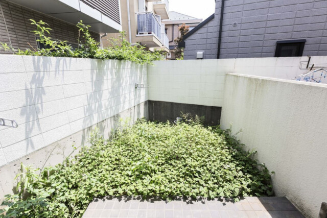 南東向き窓の外にはテラス、その向こうにはワイルドな専用庭が続いています。お洗濯物が干せるよう壁に物干し金具も付いていますよ。ご覧の通りの日当たりなので気持ちよく乾きそうです。生い茂った雑草を綺麗にすれば庭で園芸とかも楽しめそうですね♬ 個人的にはこんな感じも好みですが、このままじゃお洗濯物干しに行くのも大変ですから(笑)