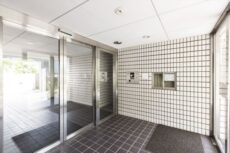 安心のオートロック付きです。中へ入る前、右に管理室の窓があり、左に集合ポストがあります。オートロックを解除し中へはいるとシンプルなエントランスホールがあり、中庭には木があり上を見上げれば空がみえます。きれいに掃除されており開放感あるエントランスホールです。