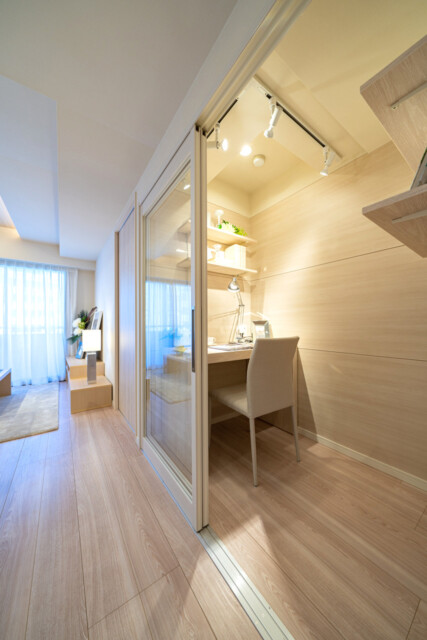 キッチンの横にはDENがあります。リビングダイニングキッチンとガラスの引き戸で仕切られたこちらの空間は、在宅勤務時の執務スペースにぴったりです。あらかじめ棚やデスクが備え付けられている、とても機能性の高い空間です。ちょっと大人の秘密基地っぽいところも良い感じ![]()