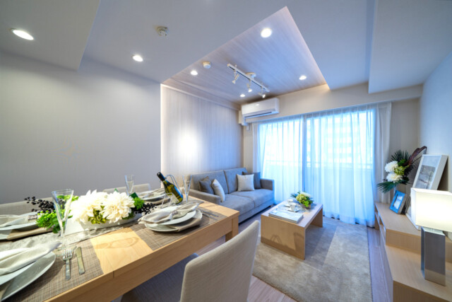広いというわけではないのですが、家具をレイアウトしやすい形状のお部屋ですので、ダイニングセットやソファセットも配置することができます。