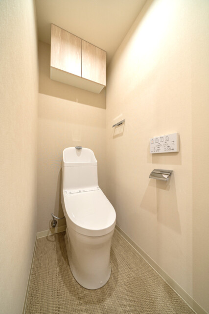 トイレ上部は吊戸棚付きでトイレットペーパーのストックもこちらに収納可能です。便座は温水洗浄暖房便座で、毎日のトイレライフも快適ですね!