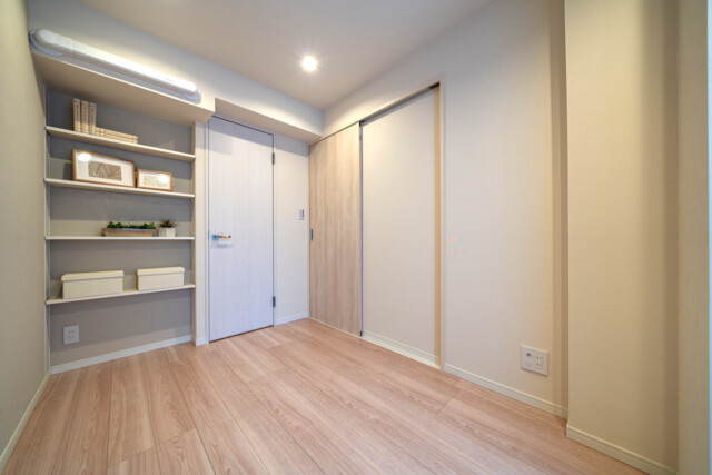 こちらは廊下から出入り可能洋室です。ウォークインクローゼットと可動棚が設置されています。もう一部屋ある洋室はリビングから出入りするお部屋となっております。