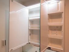 洗面化粧台は鏡の裏も収納になっており、ゴチャゴチャしがちな小物類もすっきり片づけられますよ。
