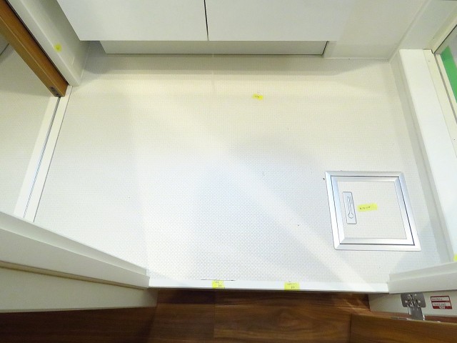 洗濯機置場はキッチンの横あたりにあります。お料理しながらお洗濯と家事もまとめてこなしやすそうです。使わない時は扉を閉めておけば生活感もバッチリ隠せます。