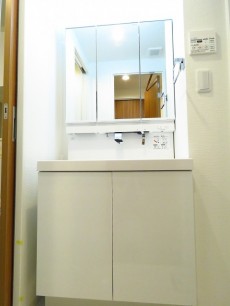 洗面化粧台は鏡の裏が一面収納になっており、ゴチャゴチャ散らかりがちな小物類もスッキリお仕舞いただけます。蛇口はひっぱるとシャワーになるのでお掃除や花瓶の水入れもしやすいスグレモノです。