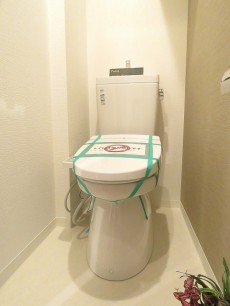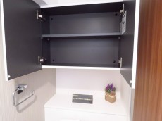 トイレは洗面室の斜め向かい側、ウォシュレットと小さ目の収納棚がついています。ペーパーのストックが入りきらなくてもマルチクローゼットがあるので安心ですね。