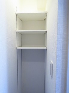 洗濯機置場の横には棚付の縦長の収納スペースになっており、掃除機や洗剤、日用品のストックなどの置場によさそうです。