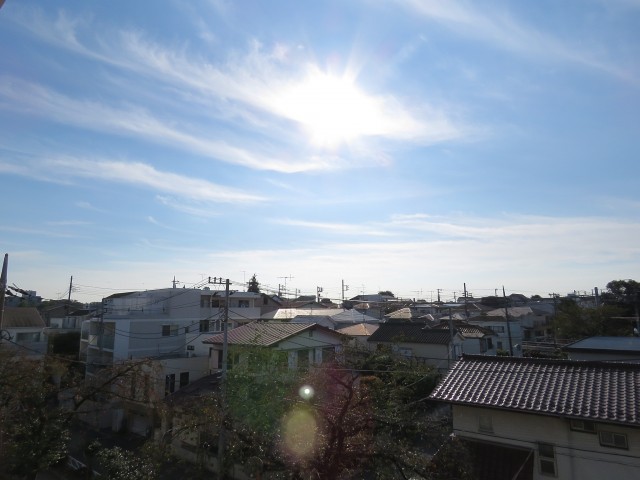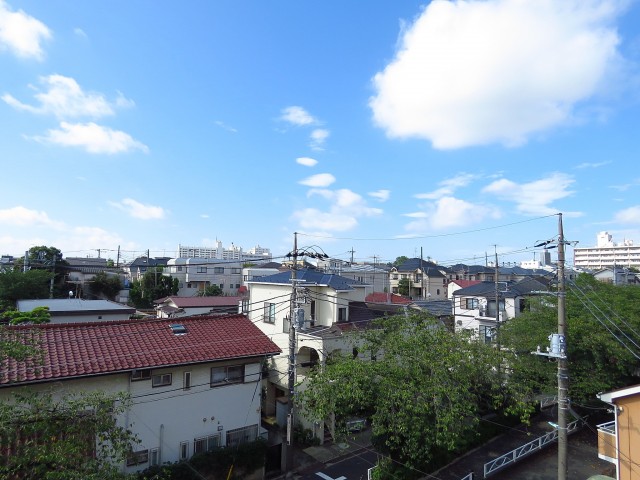 周囲に高い建物がなくほどよく抜けた開放感のある眺めです。眼下には静かな住宅街とエントランス前の緑道が広がります。